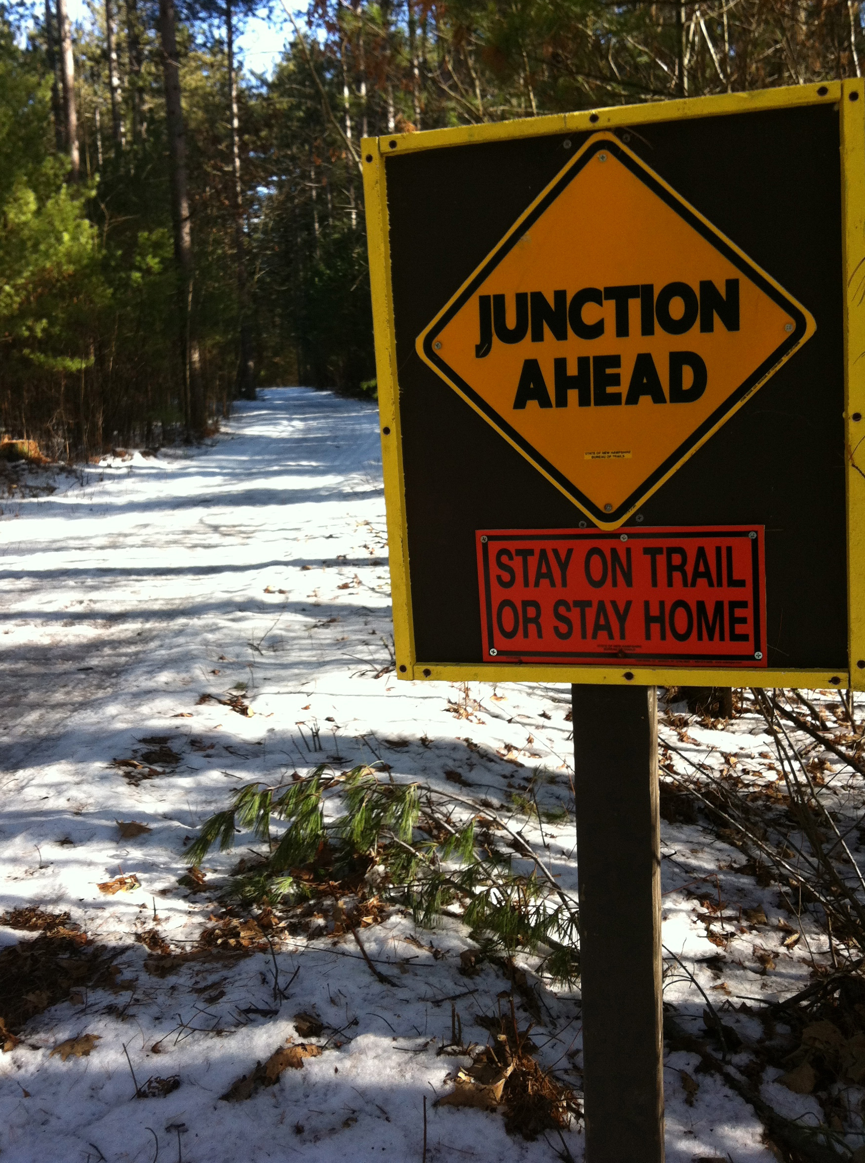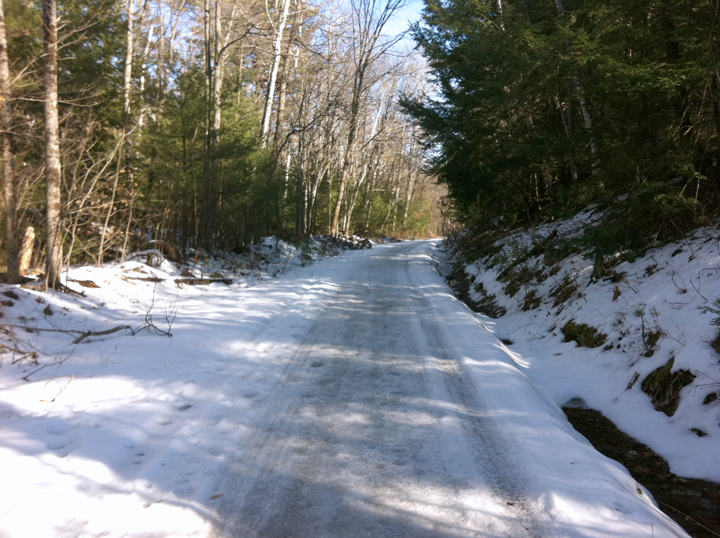 The trail didn't stay nice for long. About a quarter mile down it started to get gnarly. I didn't think there would still be so much ice, since it's all melted near my house 10 miles away. Snow racers come through a lot and draw lines in the trails, that ice over. Makes it hard to find a spot not to slip on.