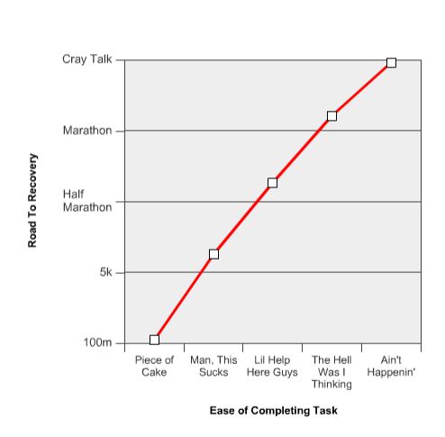 I dreaded the idea of giving in to this reality because that would signal that I was definitively very broken. Utter brokenness would mean The Husband dedicating time and energy to my care; I didn’t want to become a pain in the ass. Difficulty completing just everyday tasks meant that the road to running recovery would be very, very long. See? I even made a graph to illustrate my point: