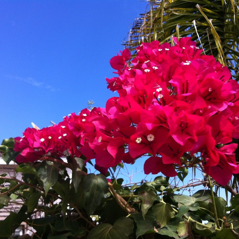 This is a beautiful place to live in, as well. Yes, of course there’s those several hundred miles of beaches and ten months of summer each year, but it’s a little deeper than that. We have mountains. Everywhere. In the next town. In your back yard. I’ve seen views from places less than ten miles from my home that stop my breath and make me so thankful to be alive that it’s almost like praying. There are bunnies and lizards, coyotes, hawks and deer everywhere, and there are even a couple of bats that like to sleep in our palms. There is a myriad of trees and flowers all around me that I’ve never seen before, like eucalyptus and olive trees, cacti, three types of palm tree, and several decadent, bright florals that I can’t yet name. There is so much sky that I don’t know what to do with it, except feel really, really small. And it’s blue…all the time. I know that these things are all novelties to some people, but I’ll never get tired of seeing the beauty the world has to offer. And this is one incredible place to see it from.