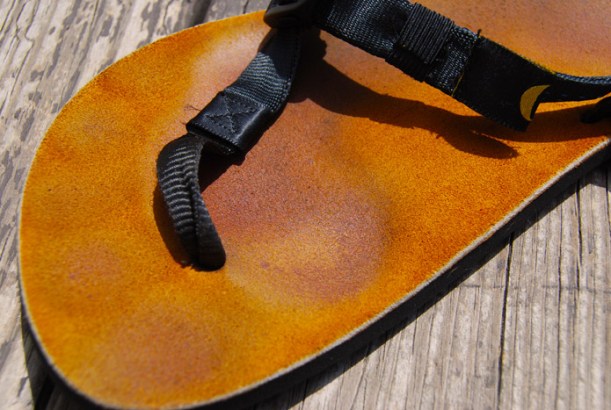 Soon as I put the sandals on they felt comfortable. The footbed is supple, soft and almost silky (alliteration is fun). The shape is exactly the shape of my foot, no falling off the edge, a big deal for me! The heel strap is elasticized for comfort and fit. The plug hole at the top of the shoe (between my toes) has an indent at the bottom, so I can’t feel a lump on my second toe like one might with some other huarache laces.
