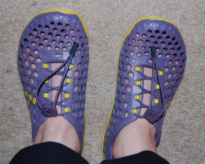 When I tried these on for the first time a few of my questions were answered right away. The EVA part of the shoe seemed so much bigger than the liner, which was way too tight and constricting. So I took it out and that immediately improved the fit. Yeah, it’s a bit of a peculiar look with my feet in full view beneath the holes, but I actually sort of like it. They are easily the lightest shoe I have in my closet, weighing in at a bare 3.1 ounces with the liner out.