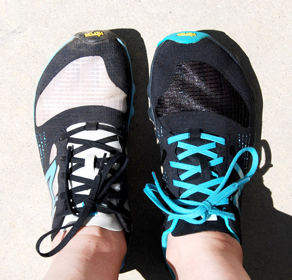 frontAside from the narrow-ish last (which is more or less Merrell’s modus operandi) that forced me to switch to the men’s version, I am impressed by the way this shoe is made. Like the men’s Trail Glove, arguably the best minimalist shoe Merrell ever made, the upper is rugged, durable and reinforced in all the right places (toe, heel, etc). I should also mention this shoe has also taken on a lot of crud, dozens of foxtails and several throws in the washing machine, so far to no loss of durability. The laces are traditional on this model, none of the lace-locking system that I know many of you loved but I didn’t particularly care for. From what I can tell, there are only small cosmetic differences between the men’s and women’s model. This is refreshing to me because in the past the women’s versions of Merrell’s best minimalist shoes have been much flimsier than the men’s, and that totally bummed me out.