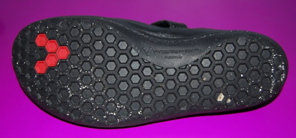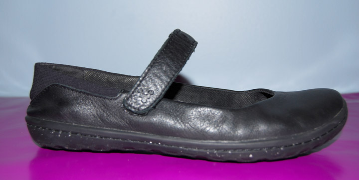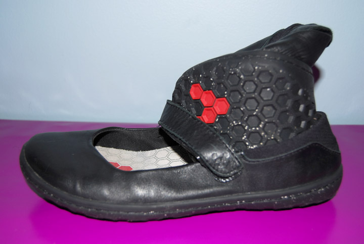 In steps the VIVOBAREFOOT Mary Jane. Like their Kali shoe that I reviewed last year, the oh-so-classic Mary Jane is made of ultra-soft Napa leather, with VIVO’s signature hexagon-patterned 4.5mm puncture-proof outsole, and a 3mm removable insole. The Mary Jane fits, wears and feels much like the popular Kali, but with some important differences. The strap is closer to the ankle on the Mary Jane, and it’s made of leather instead of elastic, with an easy velcro closure. Other unique features are the Dri-Lex moisture-wicking inner lining and the soft padded heel. The heel is an excellent feature, because it makes the shoe completely wearable and comfortable from the day you pull your pair out of the box. Unlike the Kali (as well as most shoes made of high-quality leather), I didn’t have to deal with “breaking in” the heel – something that usually involves many wears and many bandaids.