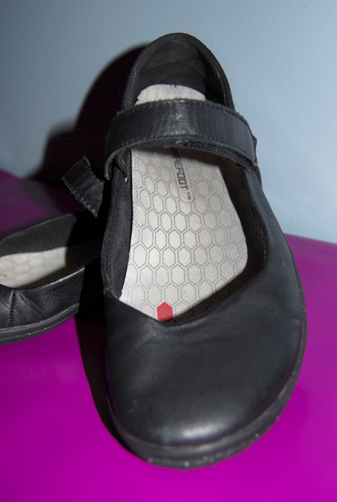 I don’t typically stand a lot at work, but a few times a year I attend trade shows and stand for 10-12 hours a day. After years of testing every kind of gel-filled, support-laden, memory foam gimmick out there, I finally gave up trying and bought a pair of these cheaply-made synthetic leather flats a few years ago (because every other “flat” in the stores still had a heel on it – so annoying). And even though those flats fell apart almost instantly and retained a rather funky odor, my feet felt better in them at the end of the day than in all the gel-laden shoes I’d tried before. It’s amazing what we can learn when we decide to simplify our lives. But I digress.